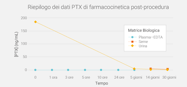 - Prove PK hanno confermato livelli di paclitaxel più bassi del limite inferiore per la quantificazione (BLQ) per entrambi il plasma ed il seme.